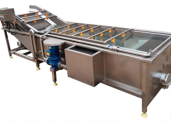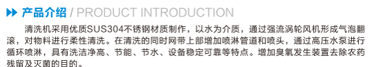 清洗机采用优质SUS304不锈钢材质制作,以水为介质,通过强流涡轮风机形成气泡翻滚,对物料进行柔性清洗。